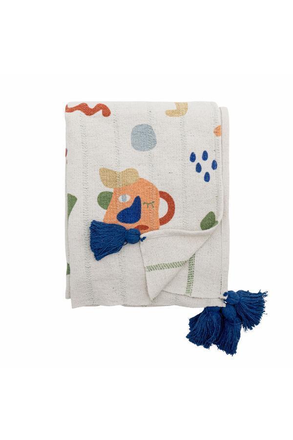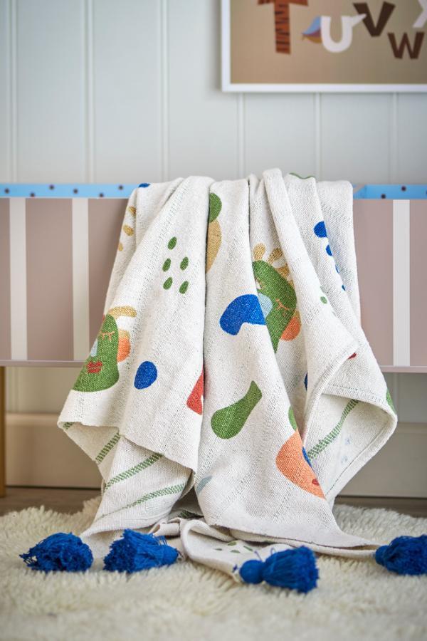 Sylvie Plaiden fra Bloomingville MINI er vævet af genanvendt bomuld og dekoreret med farverige frugtmotiver og bløde frynser. Tæppet er let og lækkert – oplagt til afslapning og leg på børneværelset.