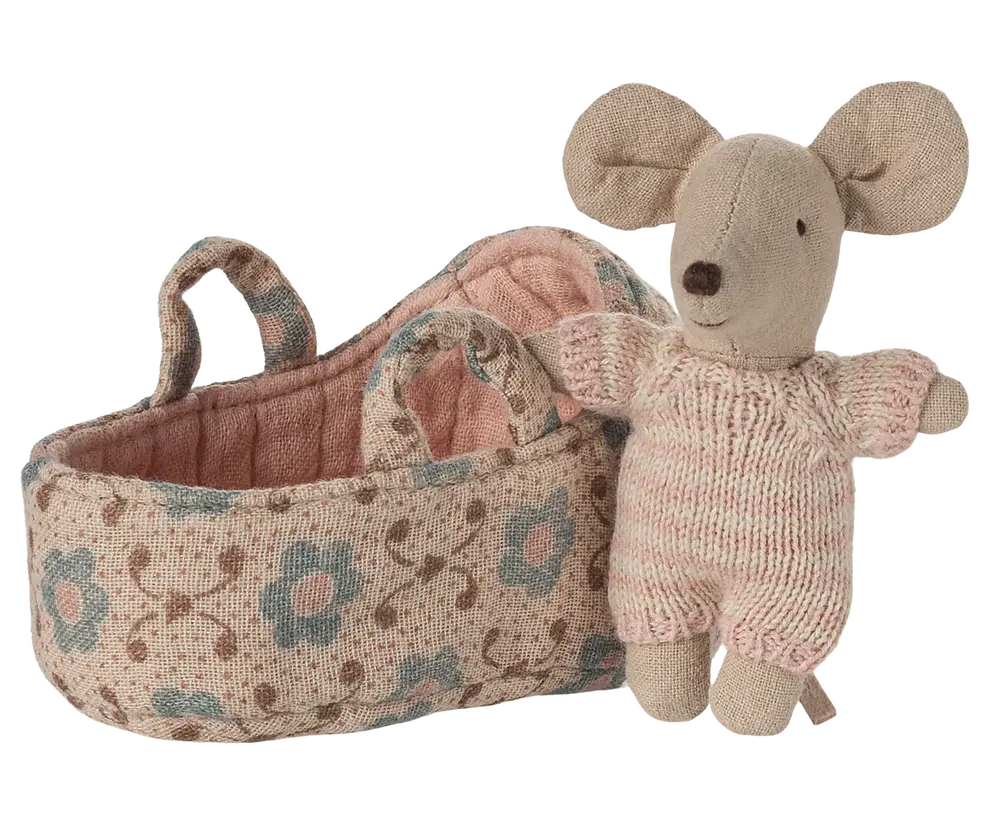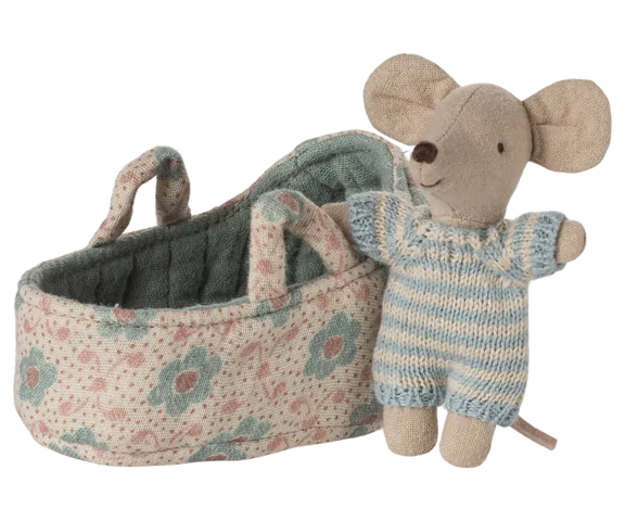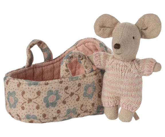 The cutest little mouse baby in a soft and striped knit suit. It sleeps for hours in its little padded baby carrier.
