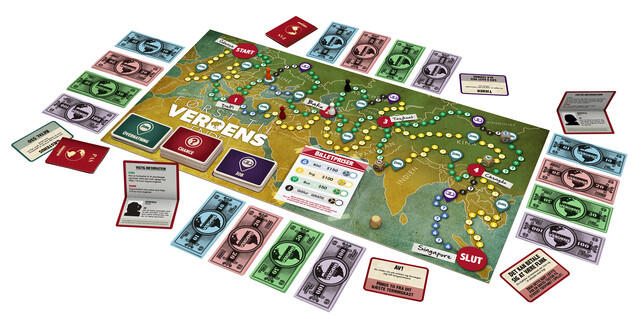 Dobbelt-sidet spilleplade, 9 rejsefæller og et væld af job-, overnatnings- og chancekort.