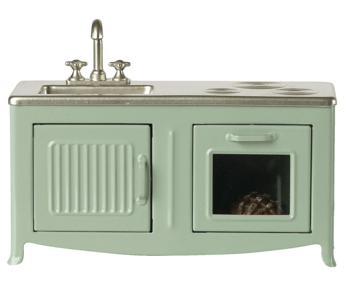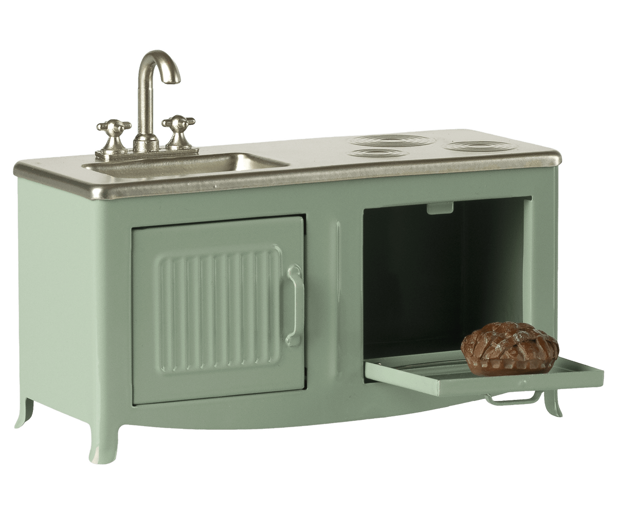 Hjertet i ethvert hjem er køkkenet, og dette fine metalkøkken danner rammen for musefamiliens hverdag. Køkkenet har en smuk farvetone og er fyldt med charmerende detaljer - fra skabslågen og vasken til ovnen, hvor en friskbagt tærte er klar. Det passer perfekt til musefamilien i størrelse og inviterer til leg, hverdagsrutiner og små historier om madlavning og samvær.
