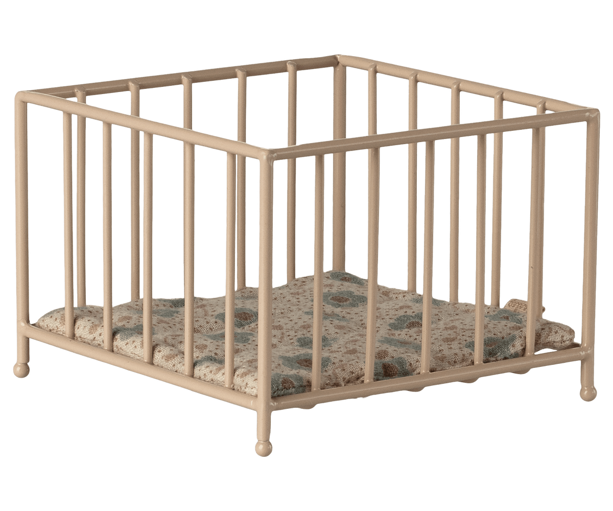 Lad din lille baby lege trygt og sikkert i denne søde kravlegård, som er perfekt til kaniner og harer i størrelse MY. Kravlegården er lavet af metal og malet i en smuk, lyserød farve, der tilføjer et blødt og hyggeligt look til legen. Forneden ligger en blød madras betrukket med unikt Maileg-stof, klar til stille øjeblikke, leg og små drømme. Et fint møbel, der udvider historiefortællingen i Maileg-universet.