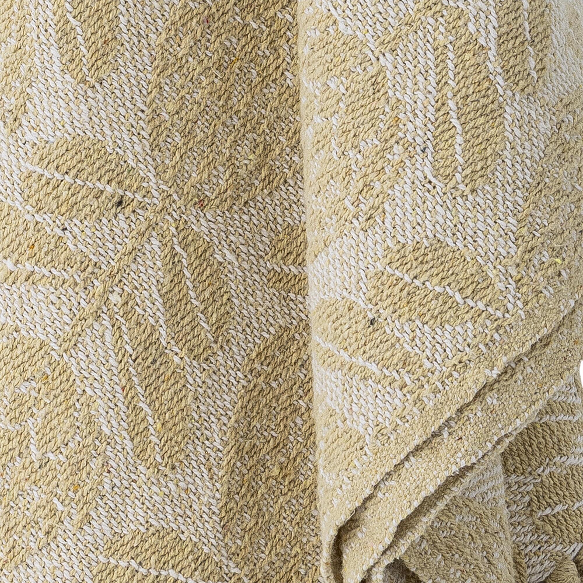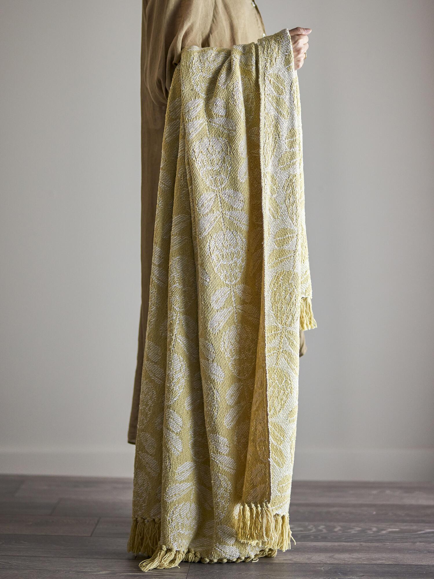 Pratello Plaiden fra Bloomingville er vævet i bomuld med et symmetrisk bladmotiv i varm gul på en blød cremefarvet bund. Mønsteret går igen på begge sider, og den har en let tekstureret overflade og lange, tæt samlede frynser for et afslappet udtryk.
